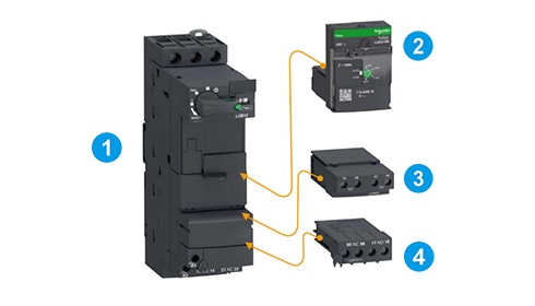 1. Base puissance Hébergement de composants, exécution de la commande manuelle ON/OFF et à distance. 2. Unité de protection Protection contre les surcharges, les surintensités, les courts-circuits, les défauts de terre, les pertes de phase et les déséquilibres. 3. Contacts auxiliaires de commande Indiquent l’état, pour l’indication et l’automatisation à distance. 4. Contacts auxiliaires de puissance Indiquent l’état de déclenchement, pour la supervision du départ-moteur.
