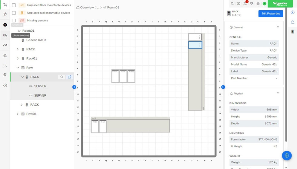 - Modellering på rackniveau giver mulighed for præcis allokering af strøm, køling og plads i hvert rack.