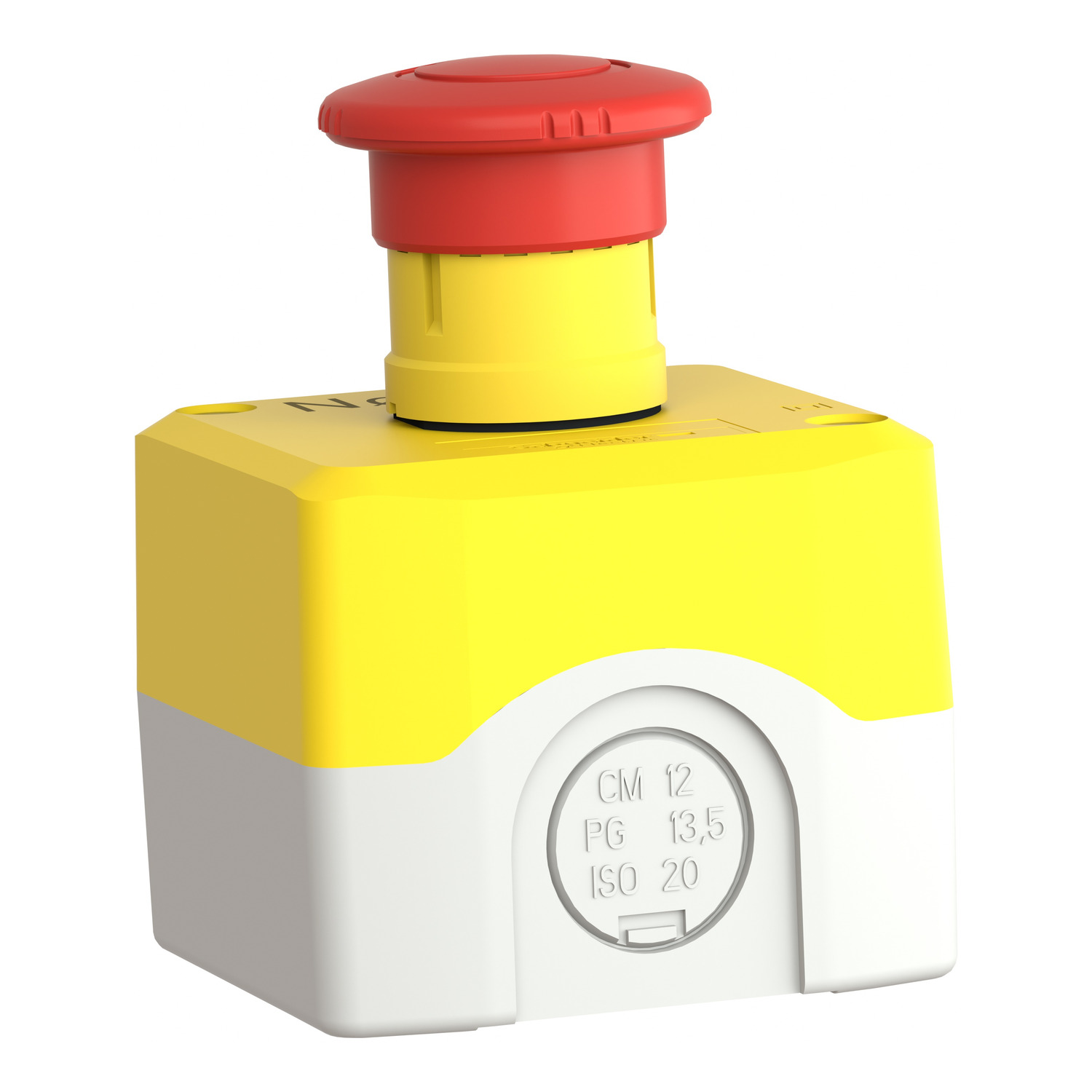 Harmony XALD, XALK, Control station, plastic, yellow, 1 red mushroom head push button Ø40, emergency stop turn to release 1 NO + 2 NC, marked NØDSTOPP