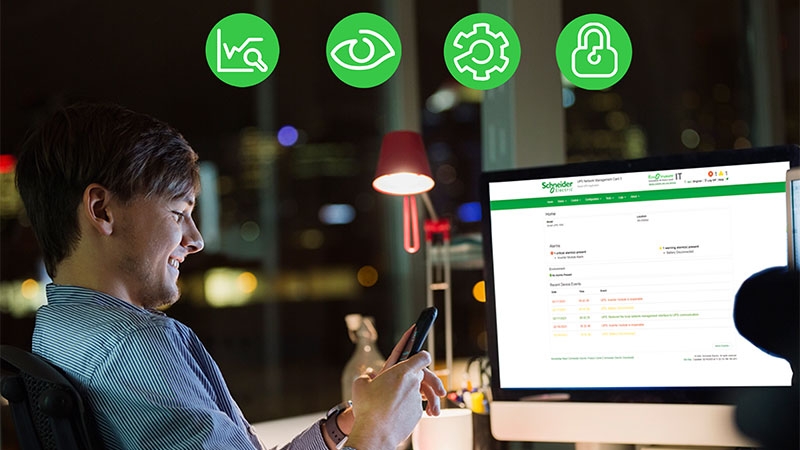 High-density technology and full-front access make Galaxy VS a footprint saver well-suited for confined spaces. Manage and monitor your Galaxy VS from anywhere, any time on any device, thanks to EcoStruxure IT software and services.