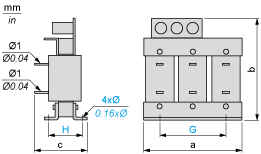 This sinus filter is an option for variable speed drives of Altivar range. Its rated current is equal to 400A. It is used as an output filter (between drive output and motor) and enables your variable speed drive to run with motor cables longer than the maximum permitted lengths. Its protection index is IP00. It weighs 190kg. It is used for applications requiring long cable runs, motors connected in parallel, submersible pumps sensitive to dv/dt, an intermediate transformer between the drive and the motor.