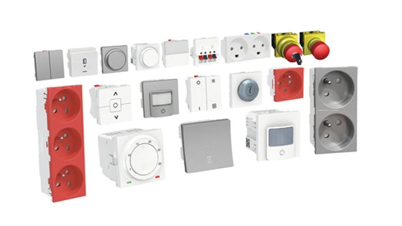 These wiring devices are designed for electrical connections and can be directly clicked into various setups like OptiLine 45 trunking, poles, posts, floor boxes, and service boxes. The Unica series includes a variety of components such as socket outlets, switches, VDI outlets, dimmers, movement detectors, thermostats, and timers. The benefits these wiring devices provide: