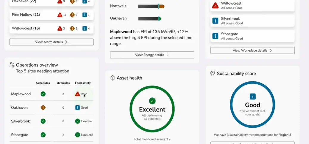 Ensure your building operates seamlessly with Building and Power Management modules designed to enhance efficiency. Remotely monitor and control systems and assets – whether it's a single building or a portfolio. Automate essential systems to reduce on-site visits, save time and money, and maintain optimal performance. Boost efficiency with AI-powered HVAC optimisation and gain full visibility into your power systems to prevent disruptions and ensure smooth operations.