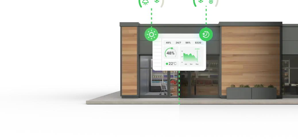 Energy monitoring of key building systems AI-powered automation of HVAC and lighting Multi-site management with remote control Anomaly detection with real-time alarms Refrigeration monitoring Food safety compliance Environmental monitoring and compliance Thermal, air quality and humidity monitoring