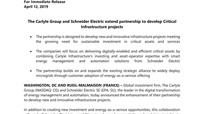 The Carlyle Group and Schneider Electric extend partnership to develop Critical Infrastructure projects (.pdf, Press Release)