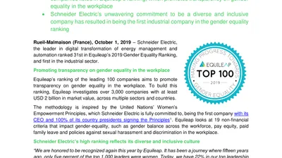 Schneider Electric ranked 1st in the industrial sector for Gender Equality, according to Equileap (.pdf, Press Release)