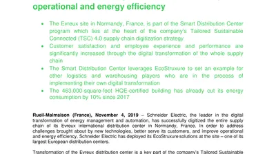 Schneider Electric Smart Distribution Center in Evreux, France, leverages EcoStruxure to improve operational and energy efficiency