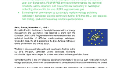 European Union LIFE Program Awards Schneider Electric for SF6-Free Capacity-Building Project (.pdf, Press Release)