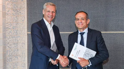 Harry Brekelmans, projects & technology director at Shell (left) and Jean-Pascal Tricoire, Chairman and CEO at Schneider Electric, formalizing the global strategic alliance.