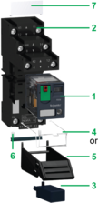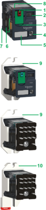 1 Push button for testing the contacts (blue: DC, red: AC) Mechanical “relay status” indicator