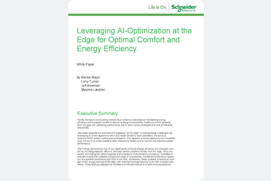 Download the full Schneider Electric white paper “Leveraging AI-Optimization at the Edge for Optimal Comfort and Energy Efficiency” by Marion Blayo, AI/ML Lead Engineer, Larry Turner, Principal Data Scientist, Jeff Bowman, Software Architect and Research Lead and Maxime Laudren, Global Expert Technical Support.