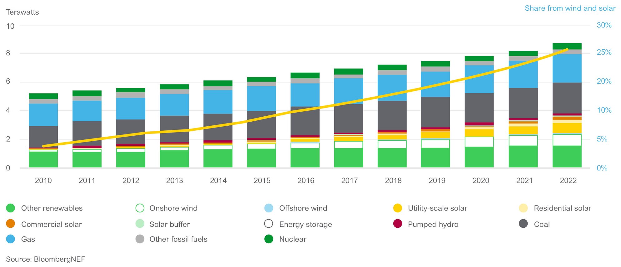 Renewable energy sources like wind and solar have firmly established themselves as integral components of the global energy landscape, currently accounting for 25% of the total electricity fleet. When expanded to include other renewable technologies like geothermal and large hydro, renewables represent over 40% of global generation.