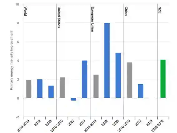 Figure 1. Annual primary energy intensity improvement, 2010-2023 and in the Net Zero Scenario, 2022-2023 Image: IEA
