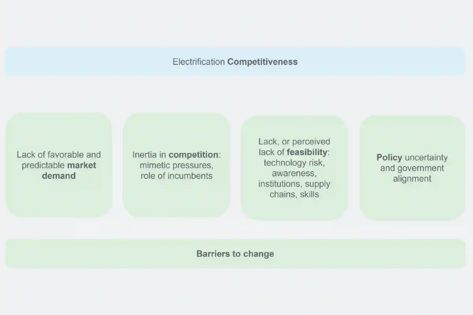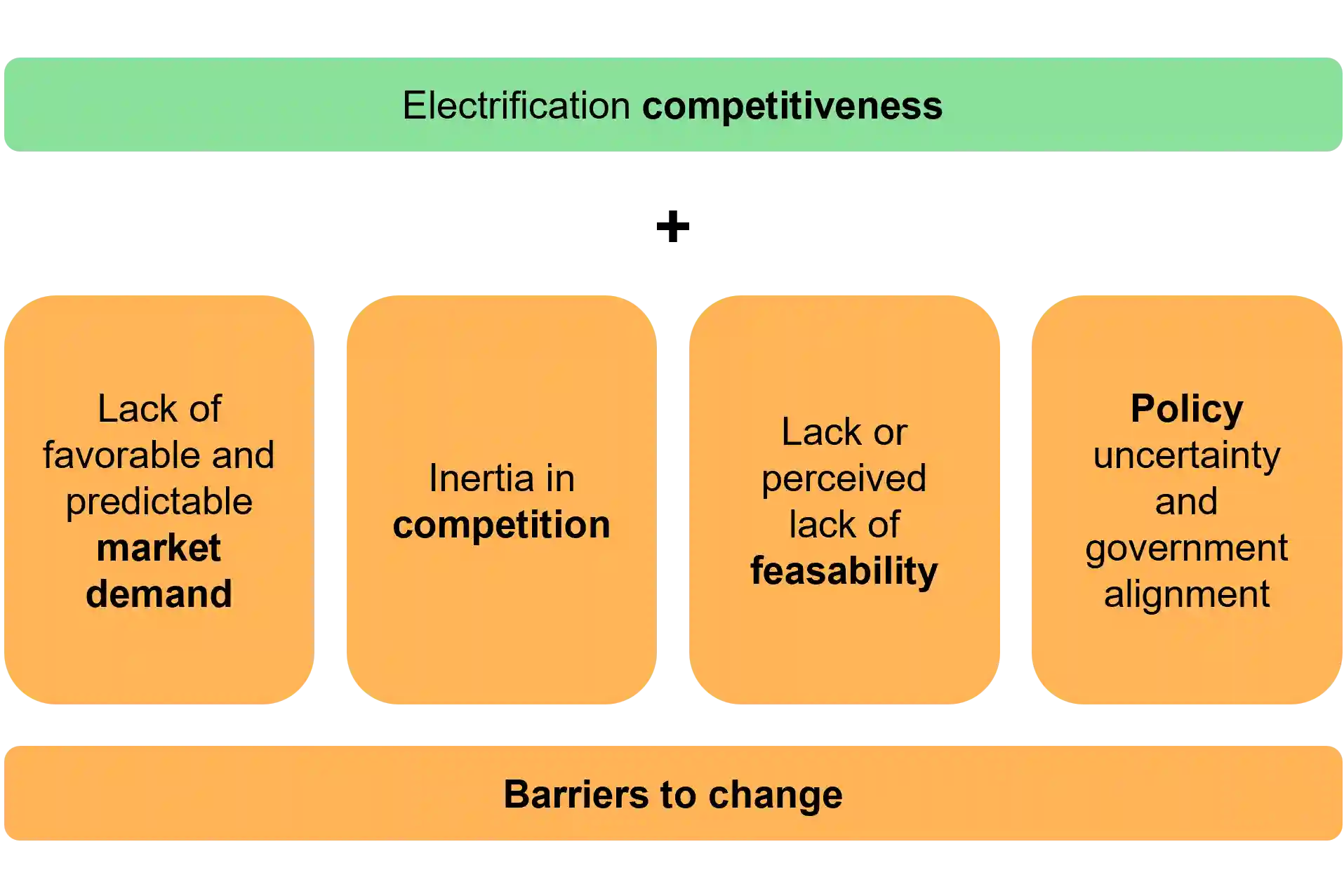 The core barrier isn't technology — it's economics and accessibility. High electricity prices relative to gas, complex financing mechanisms, and fragmented policy incentives all conspire against electrification. Inconsistent standards, information asymmetries, and underdeveloped local delivery ecosystems create friction that slows adoption even where economics are favorable. The result: a transition that should be accelerating remains mired in structural impediments.