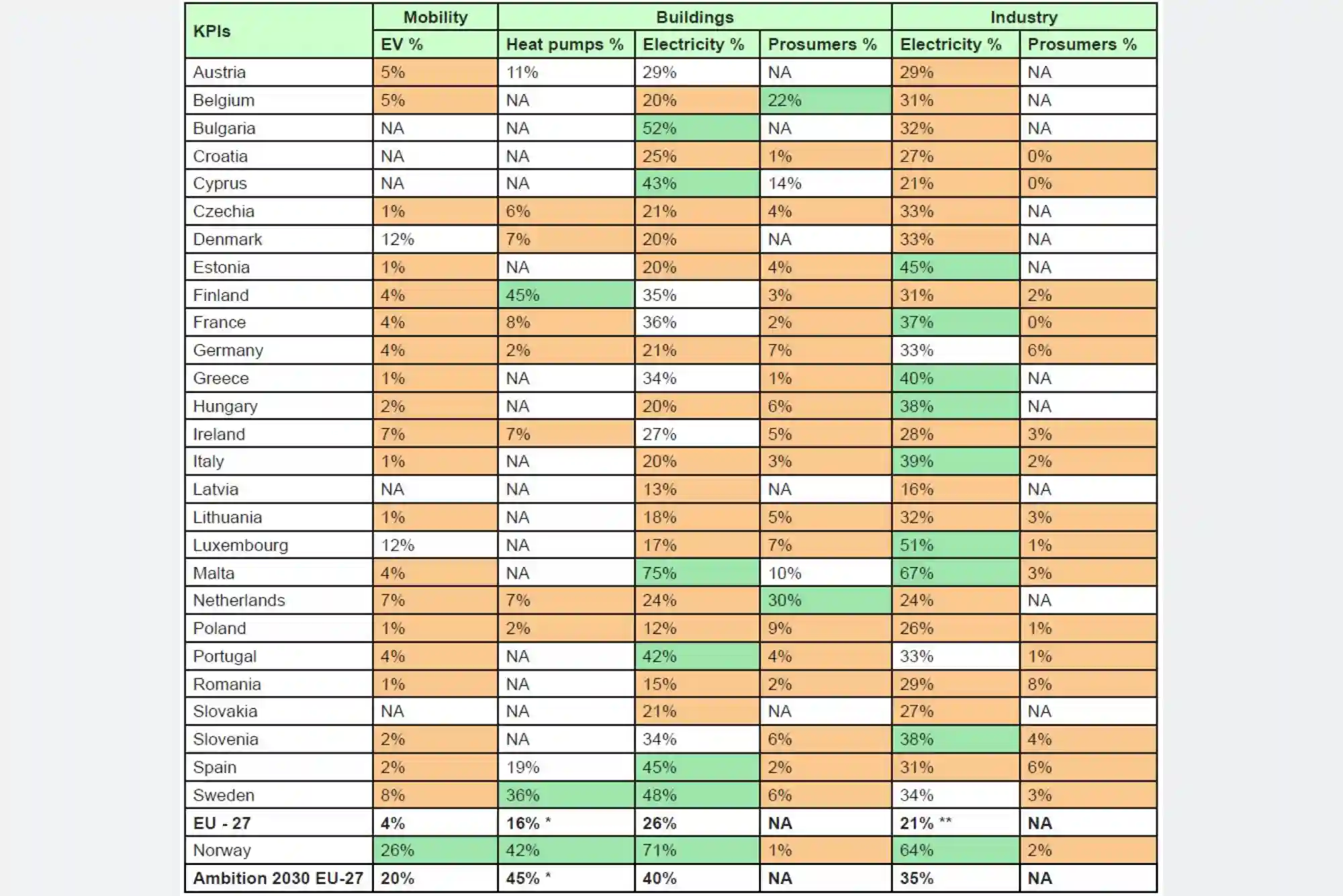 ** This figure includes non-energy feedstocks. The figures reported per country exclude energy feedstocks and correspond to an average share of 33%. The overall ambition of the EU is to reach 35% by 2030, i.e., +14 points in the mix, including energy feedstocks.
