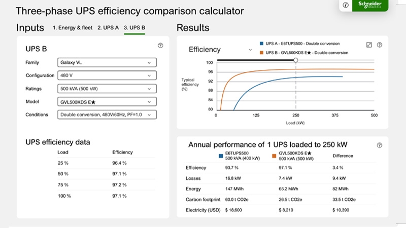 Use this TradeOff Tool to evaluate how operating a Schneider Electric UPS in eConversion mode versus the same or any UPS in double conversion mode impacts efficiency, energy consumption, electricity cost, and carbon footprint. The calculator enables you to make informed decisions about which UPS and operating mode best meets your energy-saving goals and operational needs for critical three-phase UPS applications like generative AI data centers.