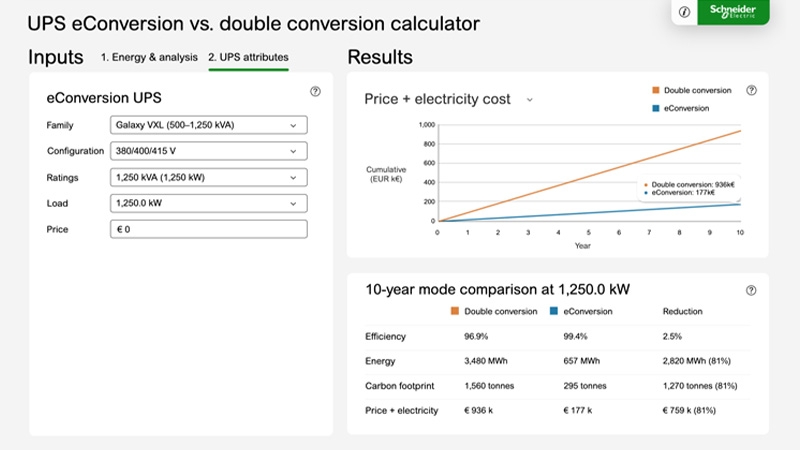 Use this TradeOff Tool to analyze the efficiency of one or two UPS systems and gain insights on how these efficiencies impact electricity cost and carbon footprint. The calculator enables you to make informed decisions about which UPS best meets your energy-saving goals and operational needs for critical three-phase UPS applications like Gen AI training and inferencing.